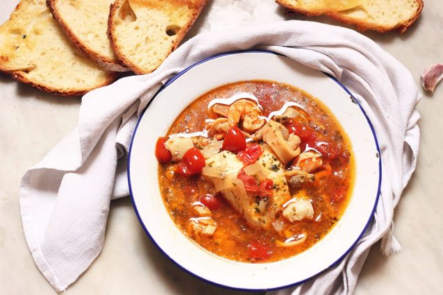 - Mettete tutti gli ingredienti in una pentola, aggiungete sufficiente acqua e un po’ di sale. Mettete sul fuoco e portate a ebollizione. Fate bollire una ventina di minuti, mescolando di tanto in tanto. Passate il saporito brodo di pesce e verdure al passaverdura oppure al colino cinese (nel secondo caso otterrete un brodo meno denso). Versate il brodo in un’altra pentola, portate a ebollizione, aggiustate di sale e gettatevi la pasta. Potete servire questa minestra di pesce completandola con un filo d’olio (che non è stato usato in cottura).